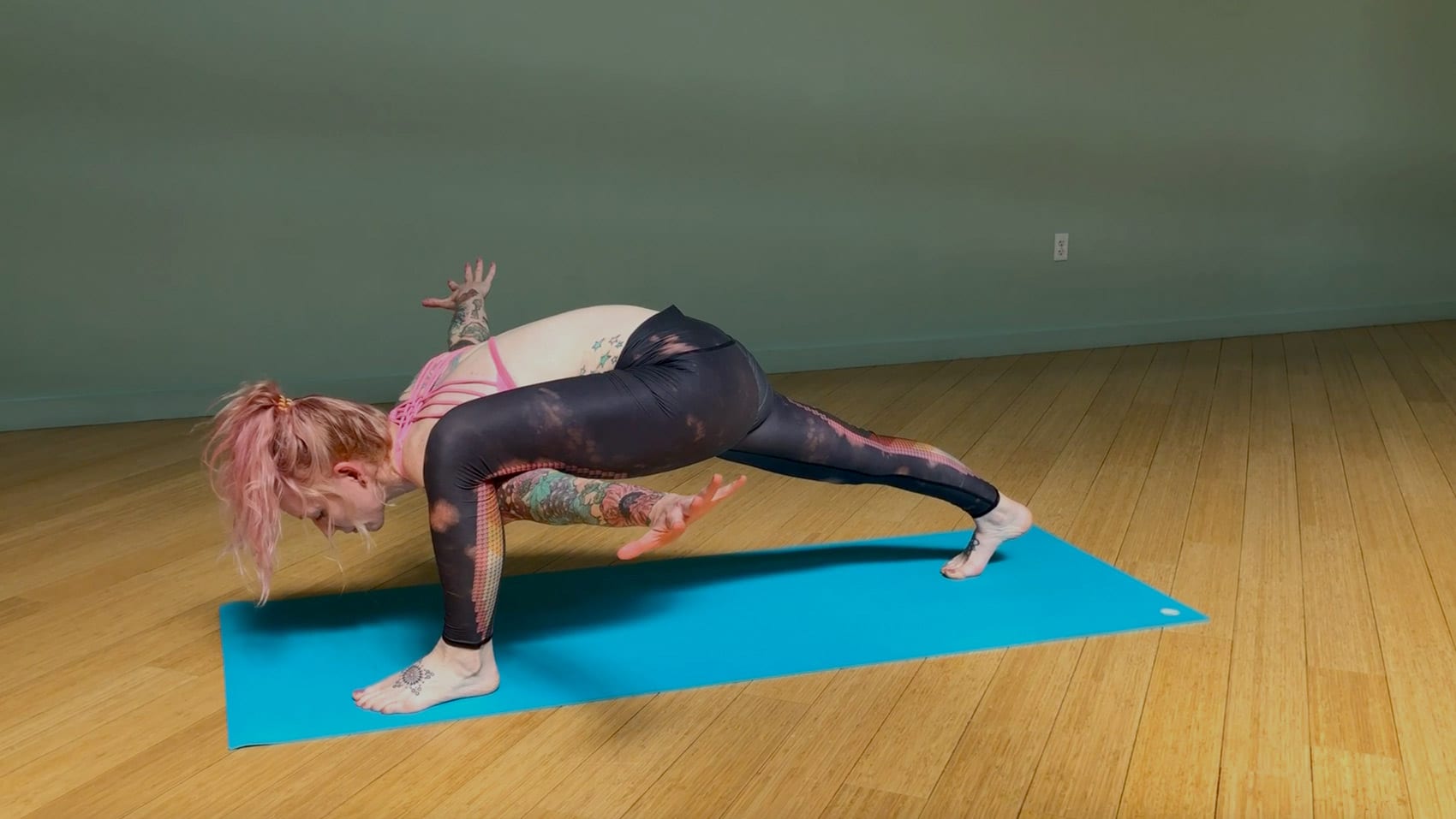 A woman poses in an Ashtanga yoga studio