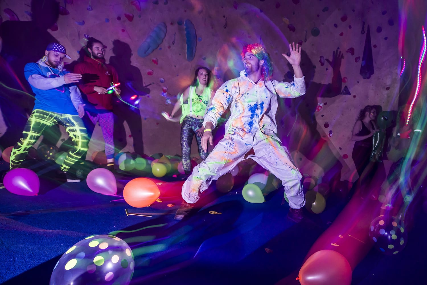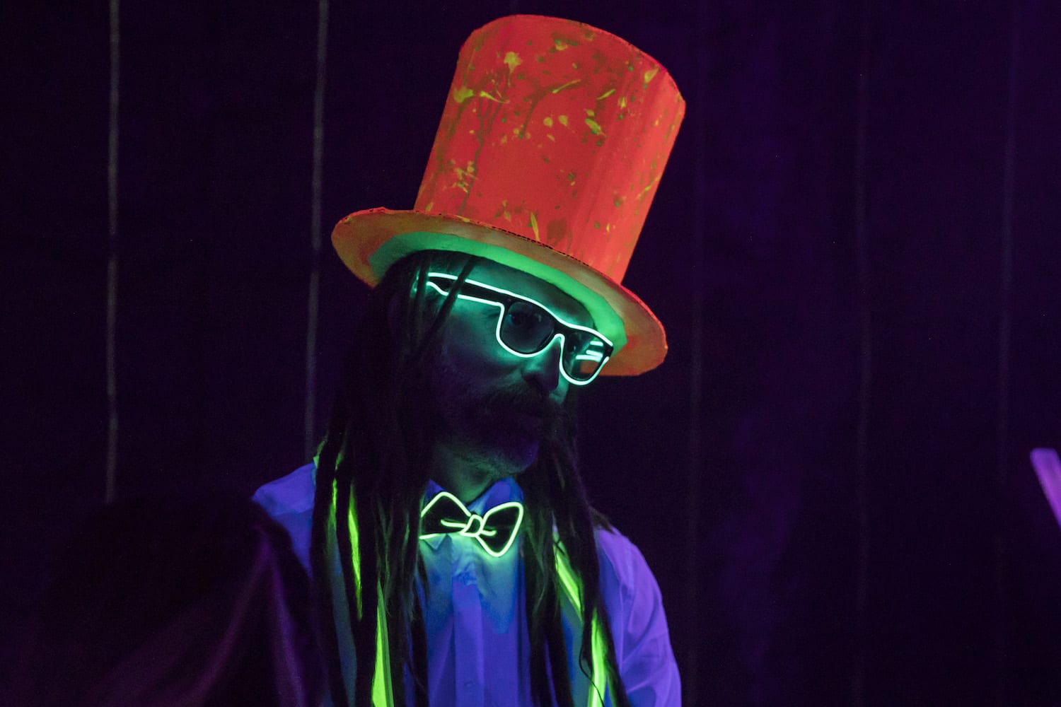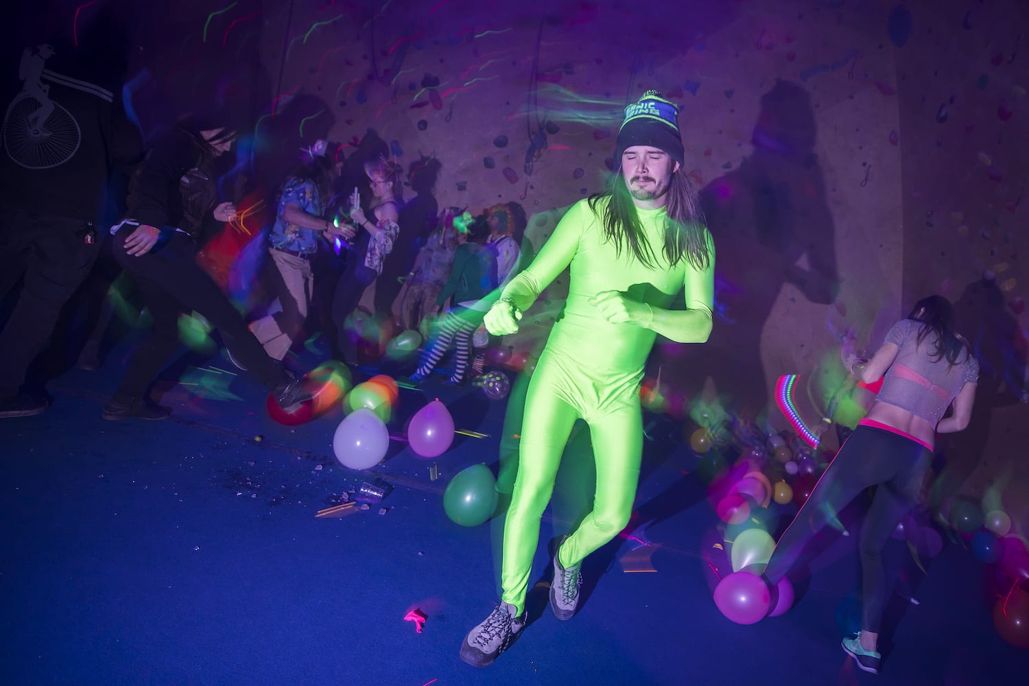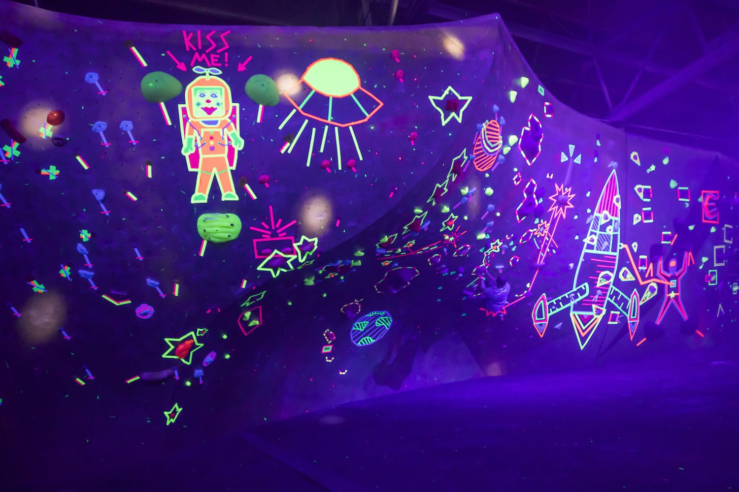 As my eyes adjusted to the bright dancing colors against the cosmic darkness, into focus came a reality of which I had only dreamed – alien creatures had landed on Earth! They stirred wildly everywhere I turned; it seemed as if they were coming from the walls themselves! Their faces, their eyes, their bodies, painted for war and echoing the neon liveliness of their Mother Ship.