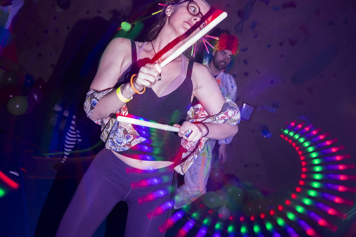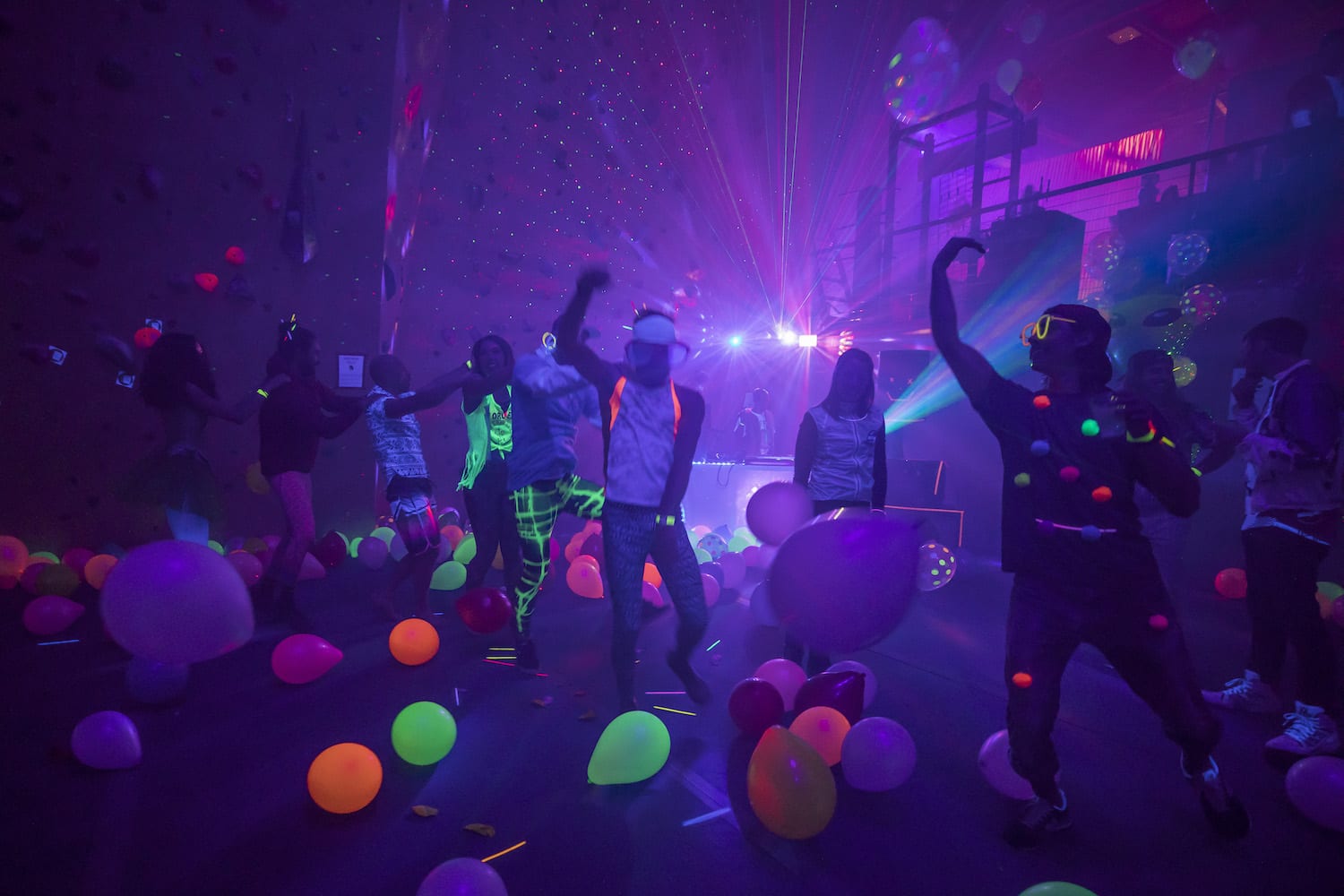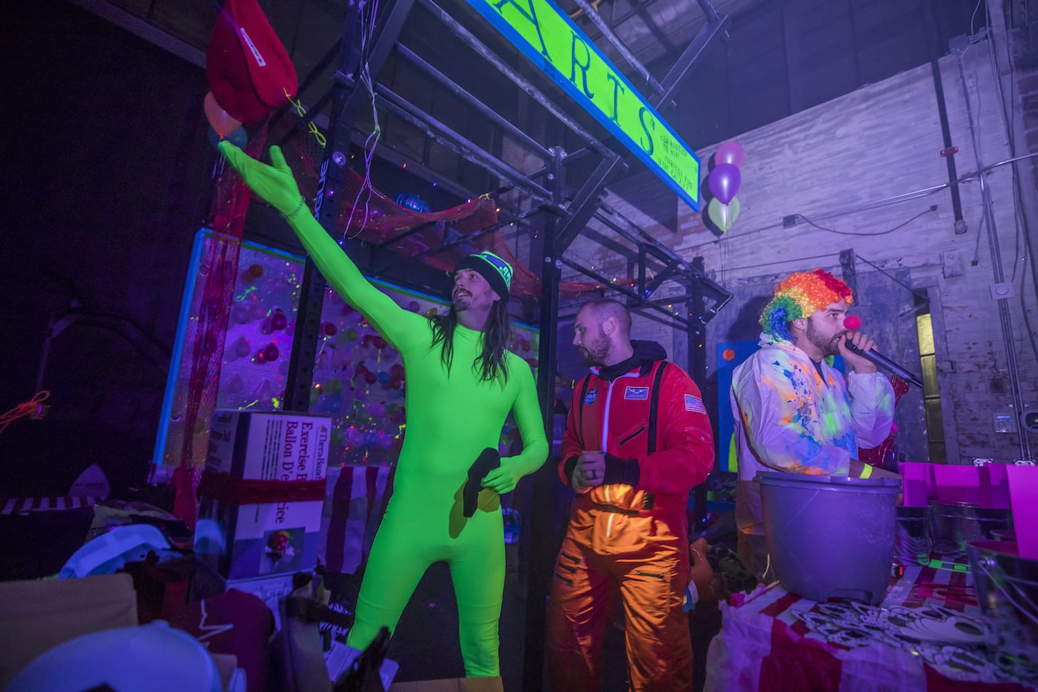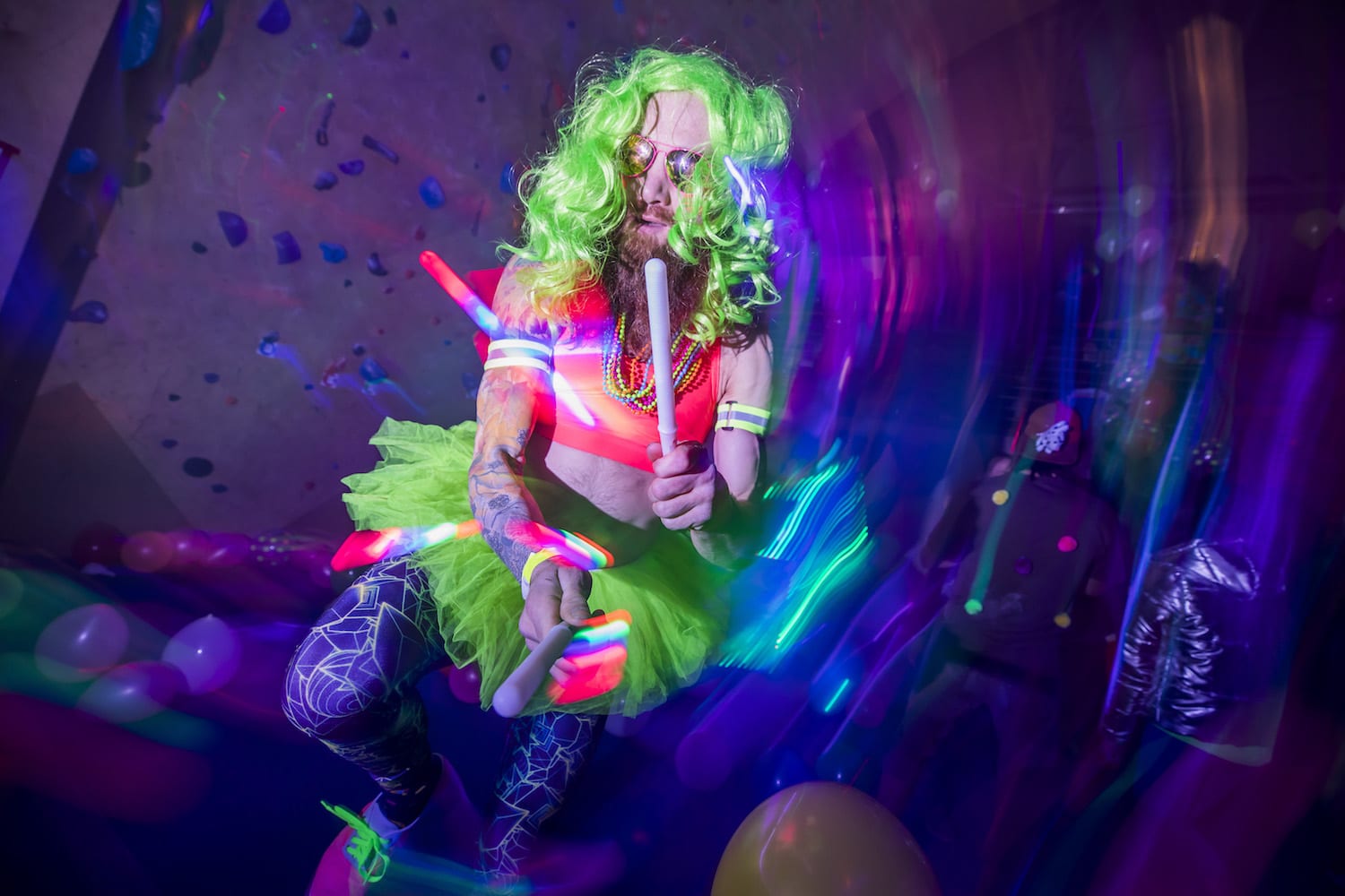 As my eyes adjusted to the bright dancing colors against the cosmic darkness, into focus came a reality of which I had only dreamed – alien creatures had landed on Earth! They stirred wildly everywhere I turned; it seemed as if they were coming from the walls themselves! Their faces, their eyes, their bodies, painted for war and echoing the neon liveliness of their Mother Ship.