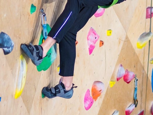 - Heel-hooking, which is when you use the back of your heel to pull on a hold with your leg. This is often done when climbing around a corner or over a roof