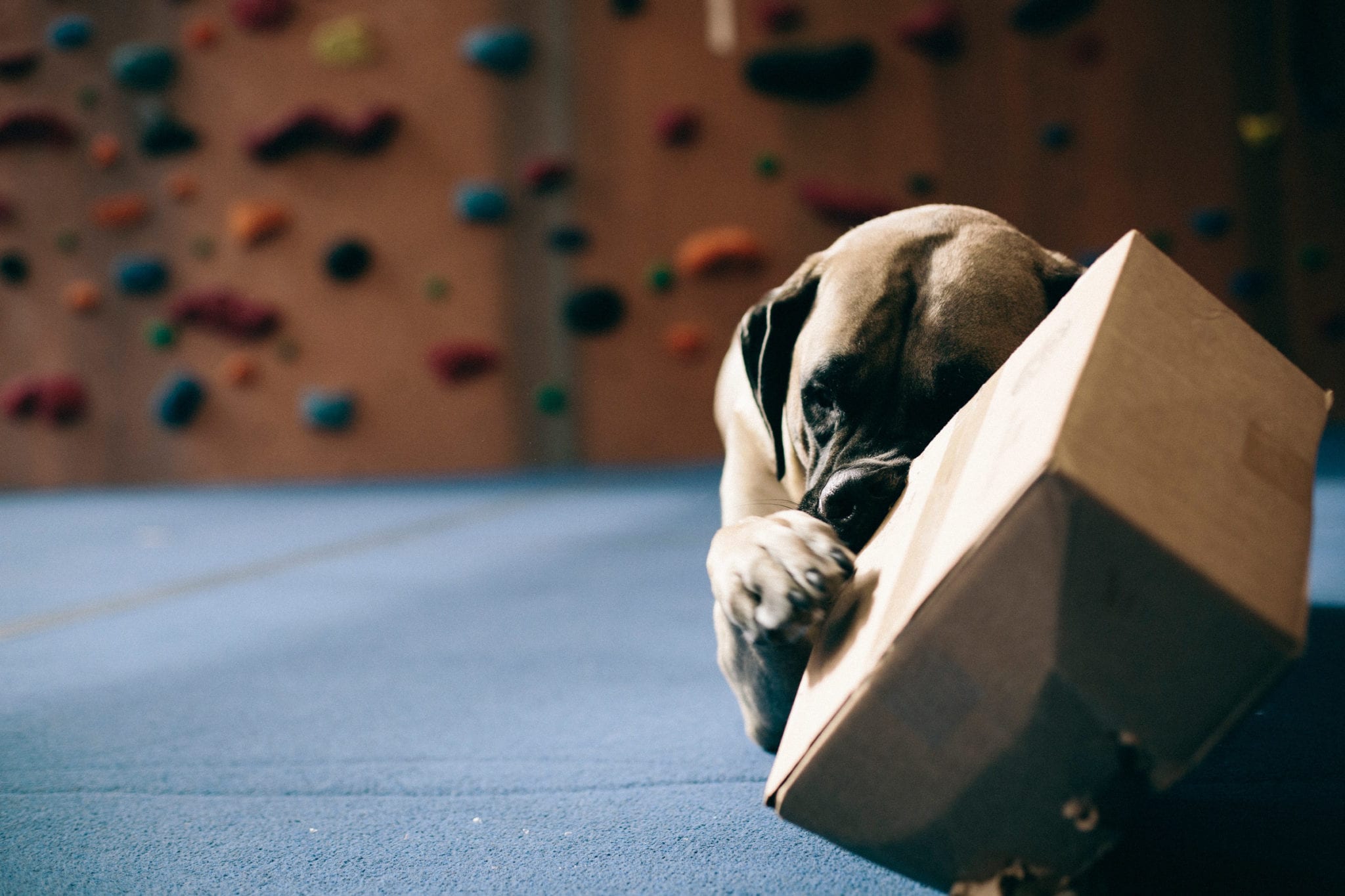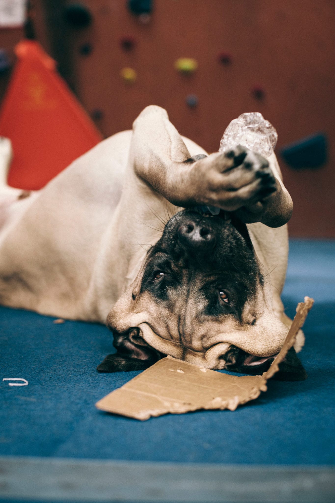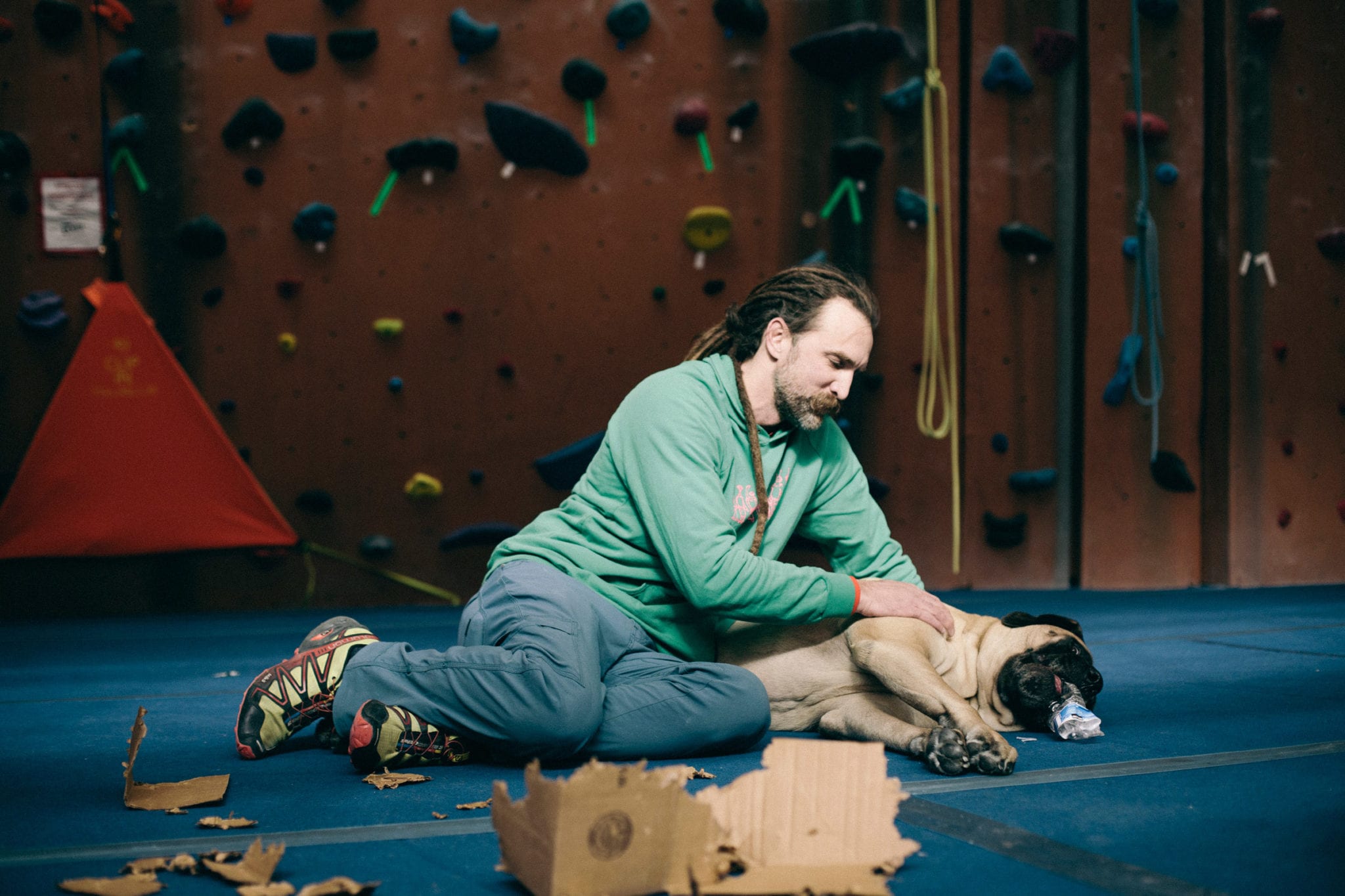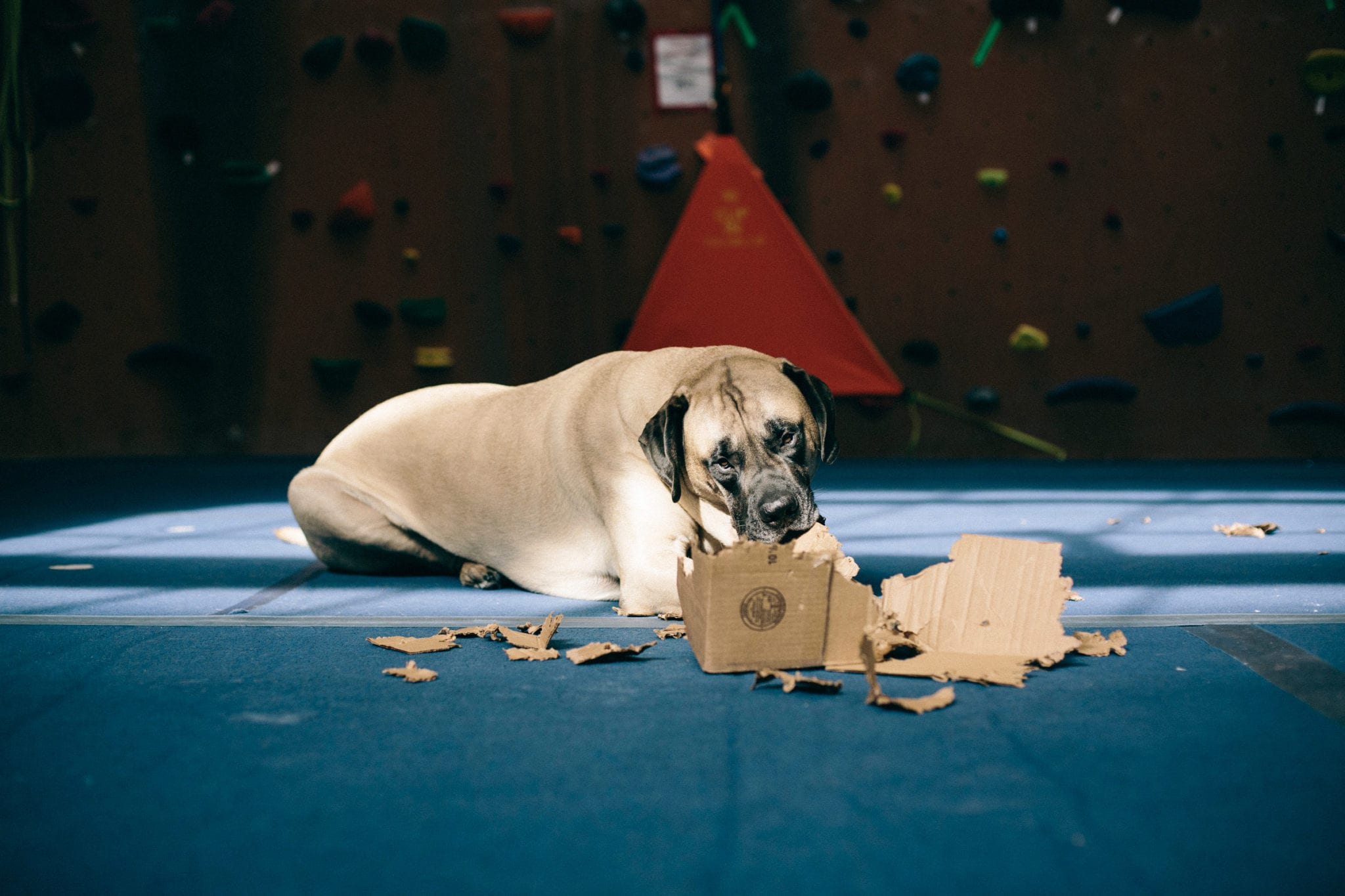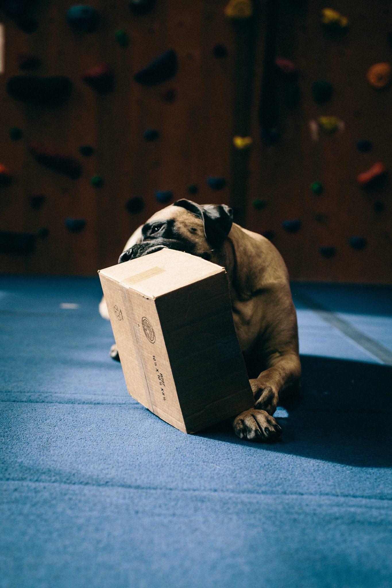 When I’m not out adventuring, I’m at The Front. The climbing gym is the best place in the world. I hate getting out of bed so early, but I know all my friends are there waiting for me. Did I mention that I like people? I have over a billion friends that love me. You can even check my Insta account for proof. I love them too. I lay at the end of the bouldering wall and wait for the heavy petting and kisses to come. I will come sit by you while you’re climbing, sometimes crushing your chalk bag or shoes. You may have to wait for my attention if dad gives me a plastic water bottle or cardboard box. Those are my two most favorite toys.