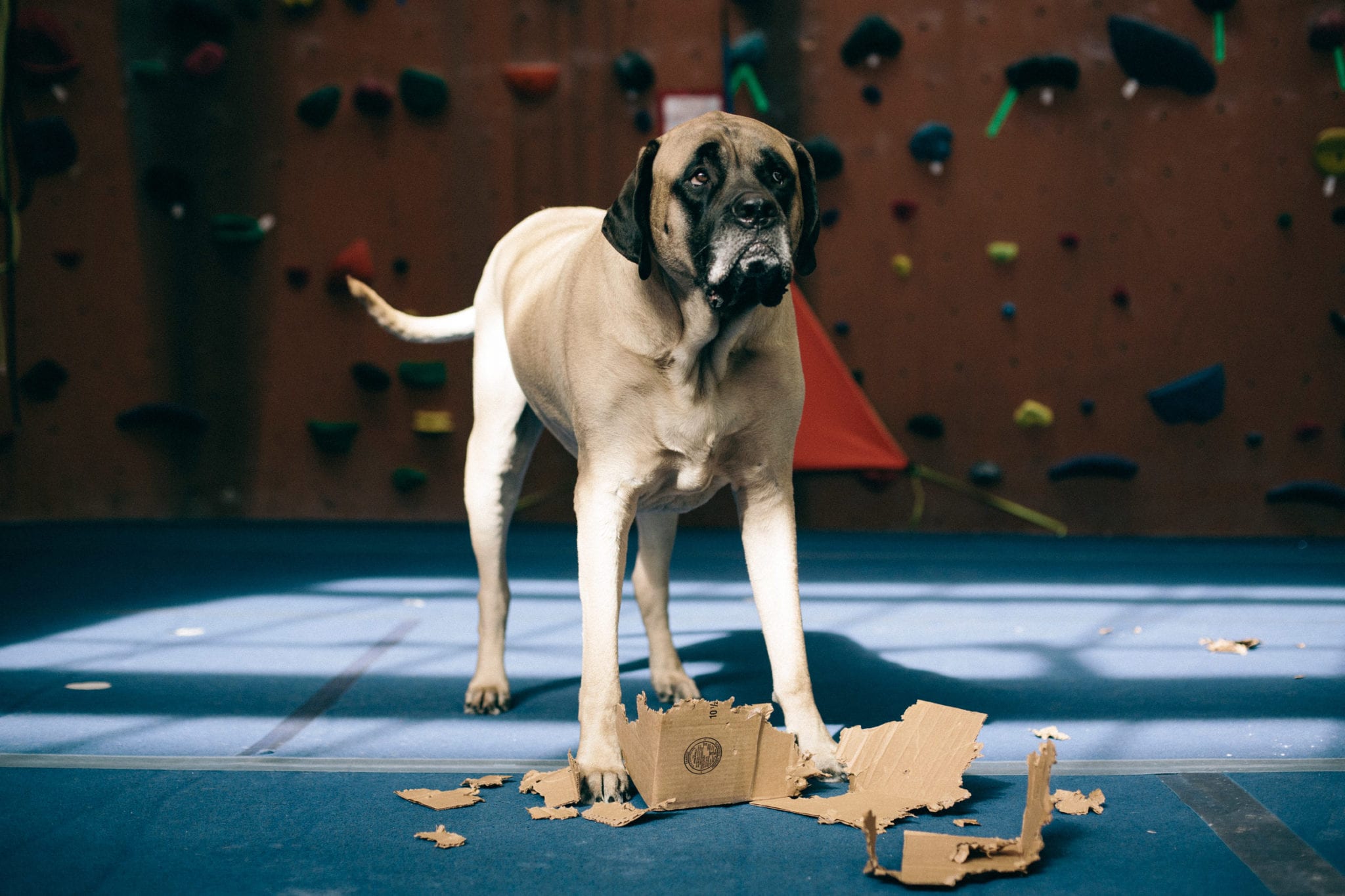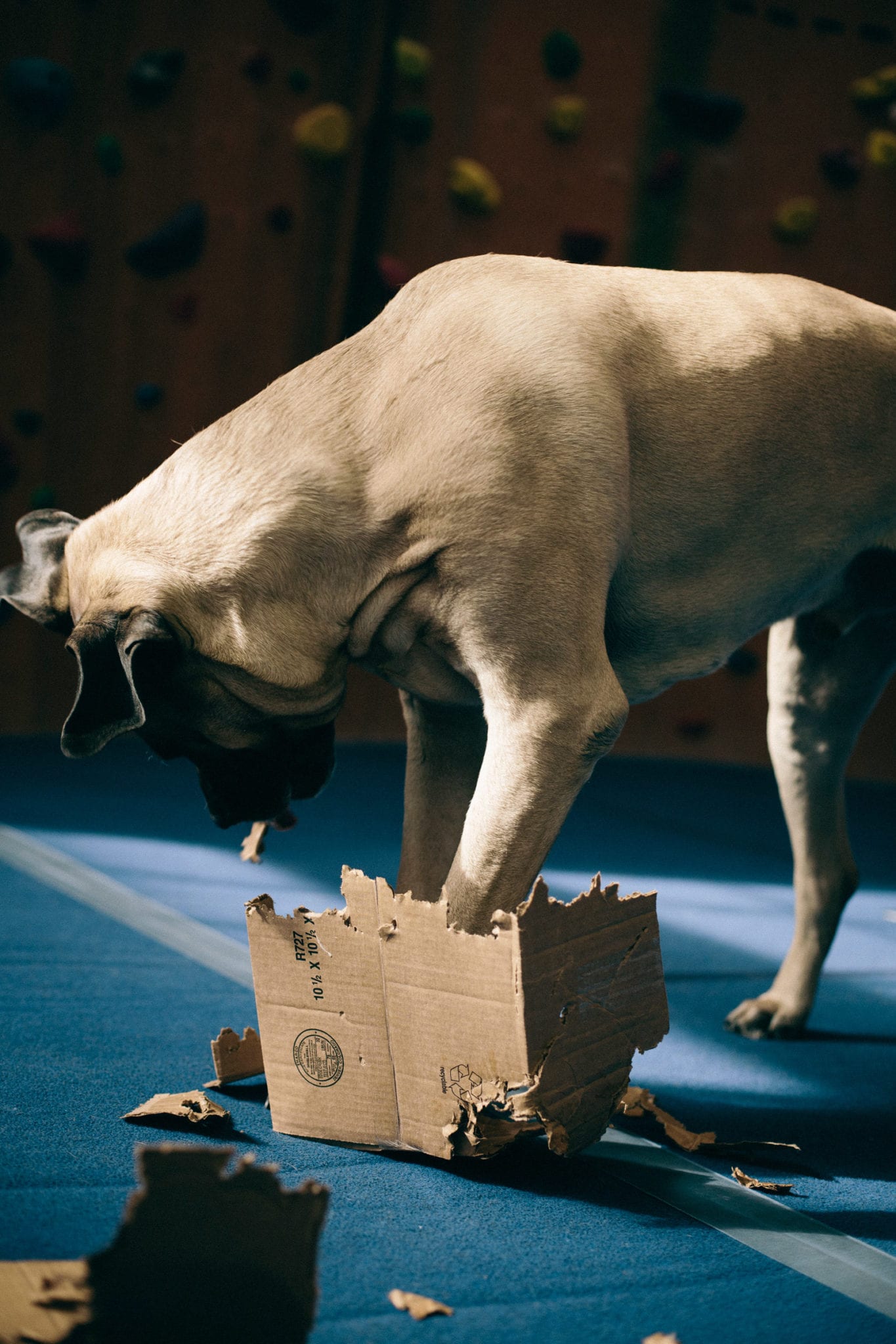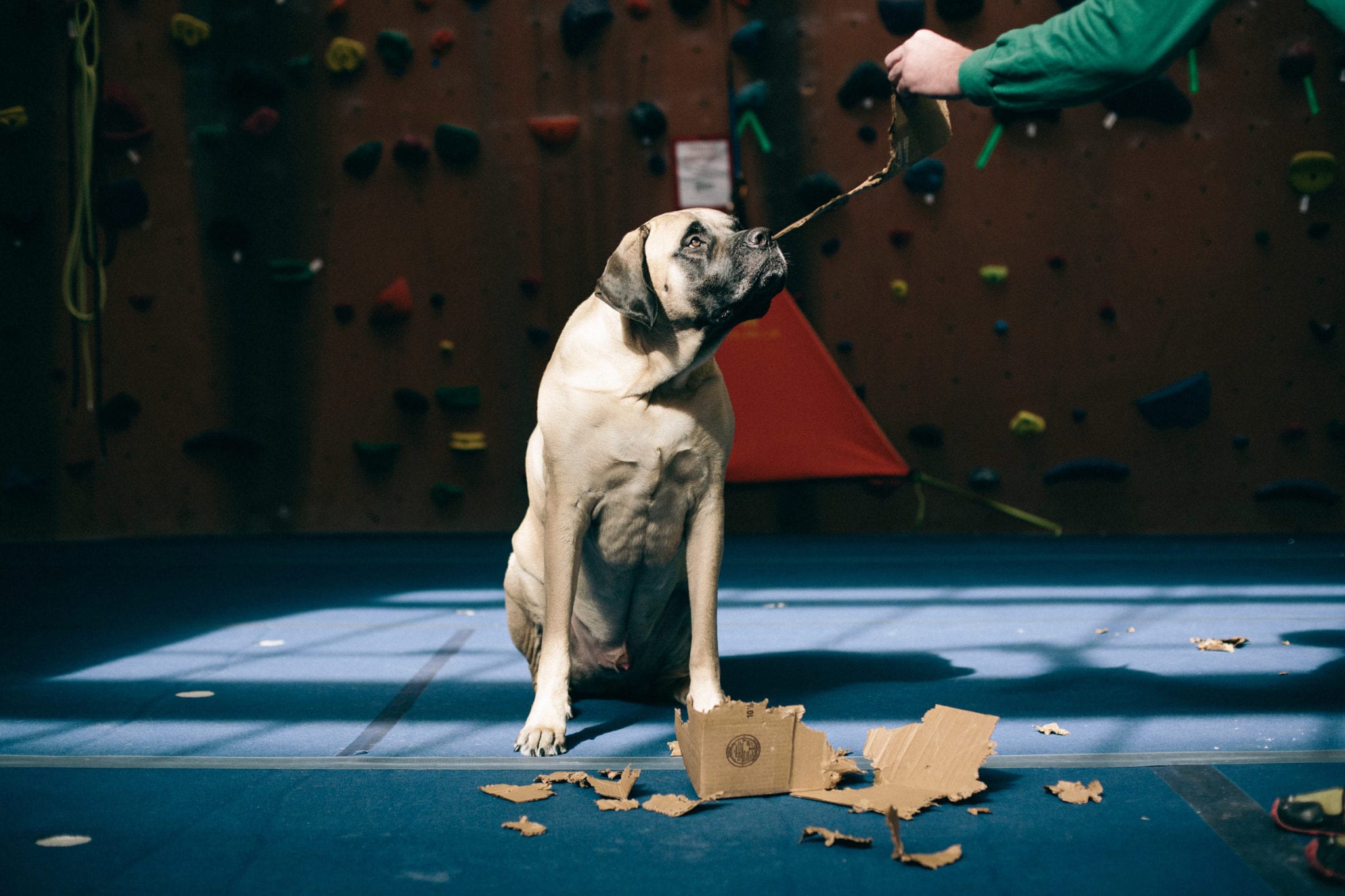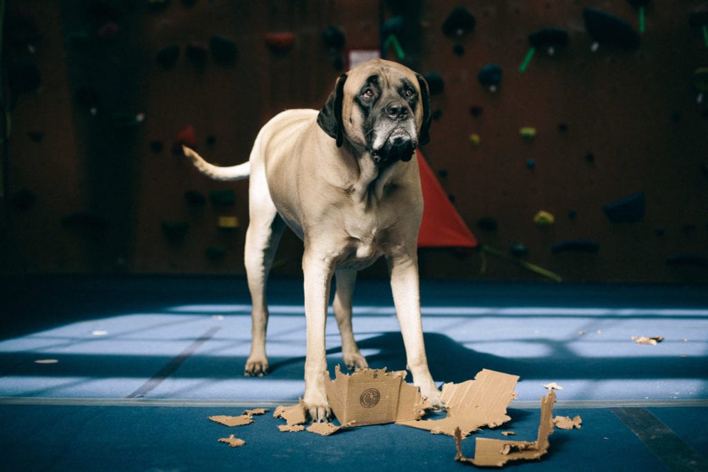 When I’m not out adventuring, I’m at The Front. The climbing gym is the best place in the world. I hate getting out of bed so early, but I know all my friends are there waiting for me. Did I mention that I like people? I have over a billion friends that love me. You can even check my Insta account for proof. I love them too. I lay at the end of the bouldering wall and wait for the heavy petting and kisses to come. I will come sit by you while you’re climbing, sometimes crushing your chalk bag or shoes. You may have to wait for my attention if dad gives me a plastic water bottle or cardboard box. Those are my two most favorite toys.
