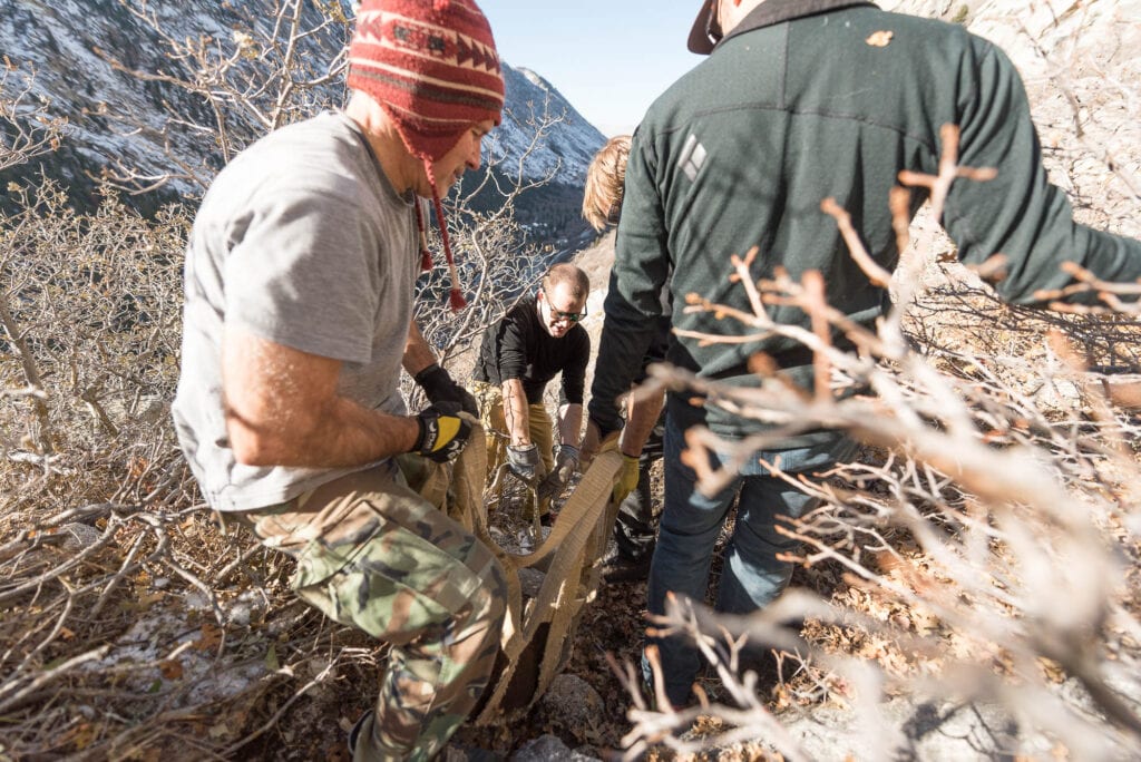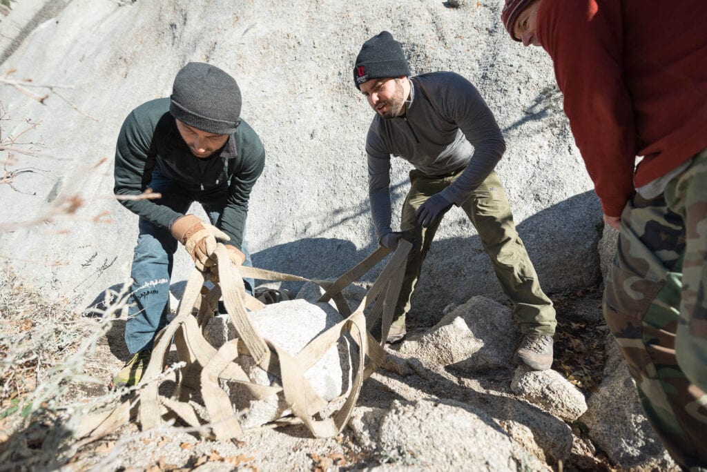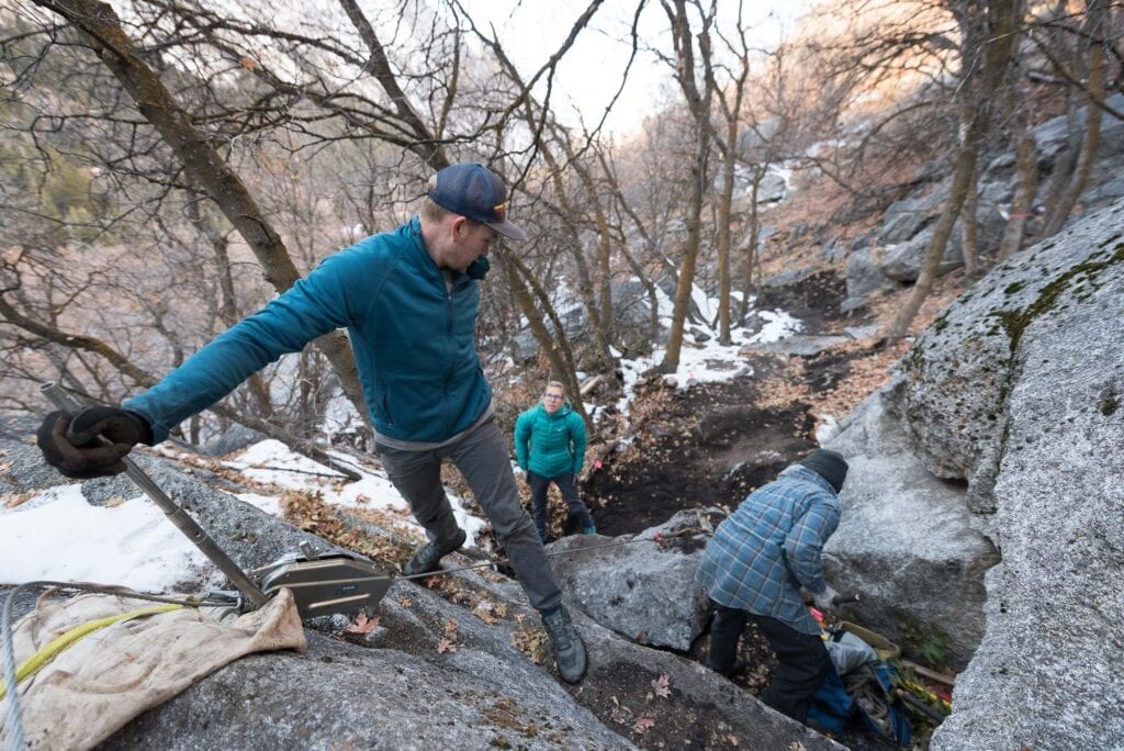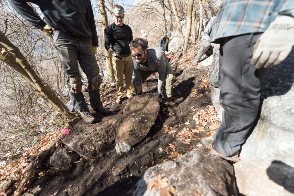 Once our stomachs were full and warm, we all headed to different worksites in the area. One group worked on creating and maintaining a trail to the 5 Mile Boulders, another brushed-in and made more obvious the trail in the talus field leading to the Schoolroom and Green Adjective Gully areas while the group I joined headed toward the Bushwack Crack and Schoolroom area to quarry boulders which would be used to finish a beautifully crafted staircase built by employees of the Access Fund and the SLCA.