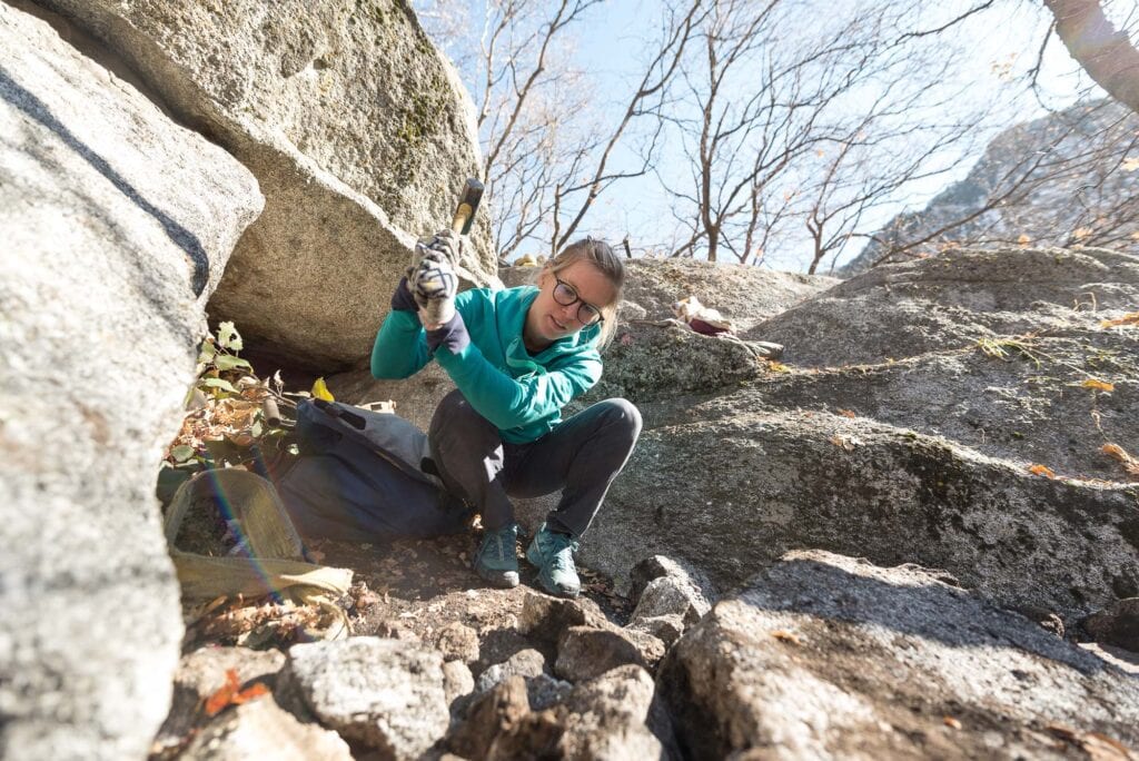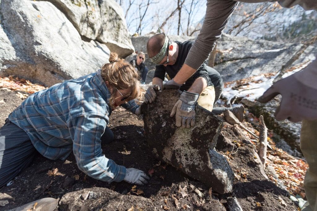 After a few hours, we moved down trail to finish the day with the 5 Mile Boulders crew. Here, we crushed stone and moved rock and dirt to make the trail more obvious, hard-packed and resistant to erosion. Countless people use these paths day in and day out, so it’s important they’re built to last.